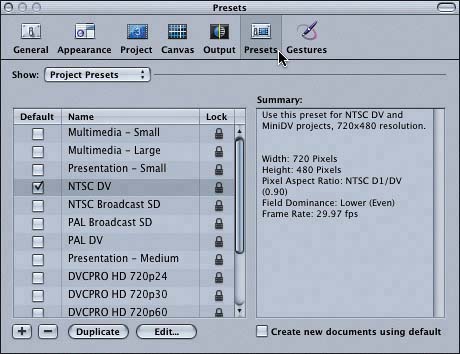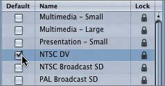 | MORE INFO You can find more specific information on the various Motion presets in the Motion documentation that comes with the application. Selecting a Default Preset If you use the same preset in most of your projects, you can set a default preset so that all your new projects will be created with the default settings. You can always change the preset or the default when needed. Let's set NTSC DV as the default preset. To set a default preset, you simply click the Default check box next to the desired preset. You can set only one default preset at a time. 1. | On the left side of the Presets pane, click the box in the Default column next to the NTSC DV preset.