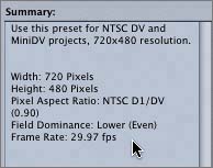 The NTSC DV summary shows that a project created using this preset will be at 720 x 480 resolution. NTSC DV is a common format for consumer video cameras and is a good resolution size for this exercise.