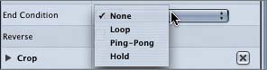 NOTE The Ping-Pong effect is more commonly used to loop a moving pattern that doesn't have a particular start or stop point or doesn't move in a specific direction. For example, you could use the Ping-Pong end condition to show globules floating around a lava lamp. Forward or backward, the globules would just appear to float around without a real beginning or ending point. | 8. | From the End Condition pop-up menu, choose Hold.