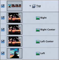 | Replacing the Remaining Objects Now that you know how to select and replace media files on the Layers tab, you can replace the rest of the stills on your own. Follow the sequence here to complete the task. Start with the Top sublayer and then move to the Bottom sublayer. Since you can't read the names of the files in the Canvas, let's rename the objects in the sublayer based on their positions to make them easier to identify. 1. | Double-click the name of the lowest object in the Top sublayer and type Left in the name field; then press Return.