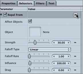 | Resetting Parameters in the Inspector The secret to making the Repel From behavior work is experimenting with the parameters until you get the desired result. Let's re-create the effect we just saw by setting the Repel From parameters from scratch. First, let's reset the current parameters in the Inspector. To reset parameters, you click the Reset button (X) in the Inspector. To open the Inspector from the Dashboard, Motion gives you a really handy shortcut. All you need to do is click the Inspector button, which looks like a white circle with an i in the center.  1. | In the upper-right corner of the Dashboard, click the Inspector button.