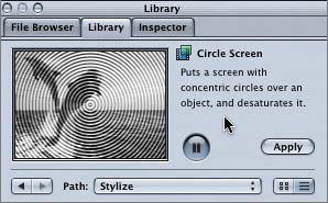 | Working with filters is very similar to working with behaviors. You can organize filters in the Library, demonstrate them in the Preview area, add them to both objects and layers, and modify them in either the Dashboard or the Inspector. The main difference between behaviors and filters is that behaviors are used to animate (move) objects and layers, and filters are used to change the way objects and layers look. Motion comes with 100 filters that are organized into categories: Blur, Border, Color Correction, Distortion, Glow, Keying, Matte, Sharpen, Stylize, Tiling, Time, and Video. Throughout this lesson, you'll work with a variety of filters to achieve different goals, from colorizing to keying out a background and adding a border. The Filter icon in Motion looks like a movie file's icon with a transparent filter applied above it. Filter icon  Let's go to the Library in the Utility window to see the different categories of filters and preview a few to see what they look like. 1. | Press Cmd-2 to open the Library tab in the Utility window.