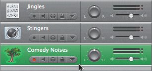 | 6. | Make sure that the Comedy Noises track is selected. Then, click the Record button to start recording. When Niki loses her grape around 2:20, press the F key on your computer keyboard long enough to trigger the first boing. Then release the F key and press the spacebar to stop recording.