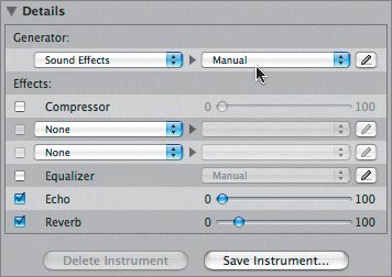 | 4. | In the Details area, select Sound Effects from the Generator pop-up menu. Then set the preset pop-up menu to Manual, if it is not already set that way.