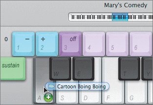 | 8. | Drag the Cartoon Boing Boing effect from the Loop Browser to the A key (first white key) on the Musical Typing keyboard.