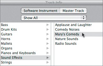 | | | 2. | In the Track Info pane, select Sound Effects as the track instrument category and Comedy Noises as the specific track instrument.