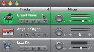| Now that you're zoomed in to the Timeline, look at the green and purple regions visible in the Timeline. Notice that the green regions have a series of dashes and lines to represent the musical note events. The purple regions, on the other hand, show a waveform that illustrates the digital recording. The editor is a tool that lets you magnify and edit a particular region or track. Opening the Editor The editor can be used to edit an entire track or a specific region within that track. The editor differs depending on whether you're working with a Software Instrument or a Real Instrument. You can have only one editor open at a time because they occupy the same space in the lower third of the GarageBand window. Let's start with the editor for Software Instruments. Remember that the green regions are created by Software Instruments and can be edited in the editor. There are four ways to open the editor: Double-click the region you wish to edit in the editor. Click the editor button, located in the lower-left corner of the window.  Go to the Control menu at the top of the screen and choose Show Editor. Press Cmd-E (the Command key and the E key at the same time). Since we haven't used any of the menus in this lesson, this is a good time to try out the menus at the top of the screen. First, you need to select the track that you wish to open in the editor. | | 1. | On the top track of the Timeline, click the Grand Piano track header to select it (if it is not already selected).