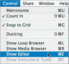 Note In this book, the shorthand for steps that involve menus is written as "Choose Control > Show Editor." In other words, Control is the title of the menu, and Show Editor is the selection within that menu. The editor appears in the lower third of the GarageBand window. The gray bars in the editor represent the individual note events displayed in Graphic view.