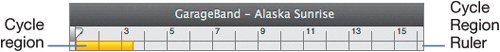 To select a specific part of the Timeline to cycle, click and drag in the Cycle Region Ruler below the Beat Ruler. The cycle region appears as a yellow bar. You can move a cycle region by clicking in the middle of the yellow bar and dragging forward or backward in the Cycle Region Ruler. You can extend or shorten the cycle region by dragging the left or right edge of the yellow bar.