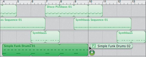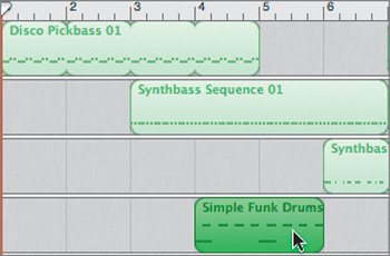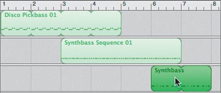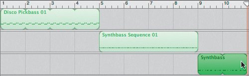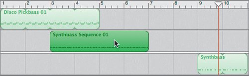 | With the SpaceBass song, it will be much easier to add the melody if we already have the rhythm tracks in place. Rhythm tracks can consist of a bass line, a steady rhythm guitar, or drumswhatever the song uses to convey the rhythm. For this song, the bass and drums will carry the rhythm. Instead of recording the bass and drum parts, you'll use some prerecorded Apple Loops. Arranging Loops in the Timeline Placing and adding different instrumental parts to build a song is also referred to as arranging a song. The bass loops for this project are already in the Time-line. The trick now is to arrange them in a way that creates an interesting rhythm pattern for the song. Using the same loop or loops over might start off sounding cool, but eventually it becomes monotonous and sounds very repetitive. Your goal in this section is to spread the loops around a bit in the Timeline to give each one a chance to be heard, and create natural changes in the song's overall rhythm pattern. Let's start by spreading them out one after another in the Timeline. 1. | Drag the Synthbass Sequence 01 region on the middle Syn Bass track to the right so that it starts on the 5th measure.