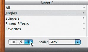 | Adding a Musical Stinger In addition to the sound effects that come with the Podcast Sounds in Garage-Band, there are also a variety of jingles and stingers. Stingers are the short sounds that are added to radio programs and podcasts to accent a moment, or bring the show back from commercial, or just get attention. In this case, you'll add a stinger to the end of the piece as a finale to the intro music and a cue for the talent (announcer) to start talking. 1. | Open the Loop Browser.