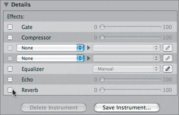 | The next step will be to add some effects to the No Effects track. Adding Custom Effects to a Track Even though your current track is called No Effects and has no effects doesn't mean that you can't add effects to it. This exercise will acquaint you with the effects included in GarageBand and how to add one to a track. You will work more with effects later in this book. For now, you will just add a simple effect like Reverb. 1. | Select the upper No Effects track, if it isn't already selected.