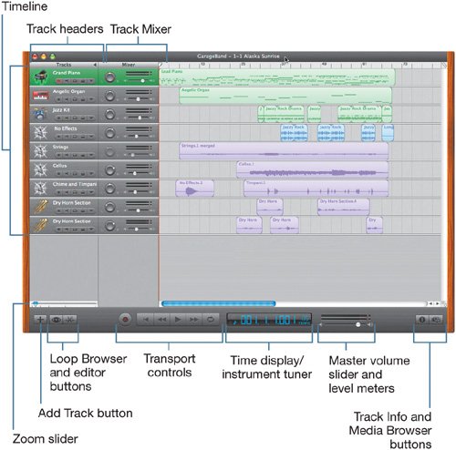 | One of the many advantages of GarageBand is the simplicity of the interface. As with all the iLife applications, GarageBand uses one window as the base of operations. This window is your recording studio. Let's take a quick tour of the GarageBand window: Track headers Show the instrument icon and name to the left of each instrument track. The track headers also include a Mute button to silence a track, a Solo button to silence all other tracks, a Record Enable button (which allows you to record to a specific track), and a Lock button to protect the track and its contents from unintended changes. Track Mixer Includes a Volume slider to adjust the track volume and a Pan wheel to adjust the position of the track in the left-to-right stereo field. Timeline Acts as your music recording and arranging workspace. The Timeline is made up of horizontal tracks for each individual instrument. The Timeline graphically represents linear time from left to right using a Beat Ruler at the top of the window. The far-left edge of the Timeline represents the beginning of a song.  Zoom slider Zooms in to or out of the Timeline. Add Track button Adds a new track in the Timeline. Loop Browser button Opens the Loop Browser. Editor button Opens the editor. Transport controls Provide the standard recording and playback buttons to navigate in the Timeline, including Record, Go To Beginning, Rewind, Start/Stop Playback, Fast Forward, and Cycle. Time display Shows the song's tempo and current playhead position in musical time (measures, beats, ticks) or absolute time (hours, minutes, seconds, fractions). Instrument tuner Located in the same space as the time display; use it to check the tuning of any Real Instrument, including vocals. Master volume slider Adjusts the output volume level of the project. Level meters Indicate the output volume level of a project and include red warning lights if levels are clipping (too loud). Track Info button Opens the Track Info pane. Media Browser button Opens the Media Browser pane. The Media Browser is a new feature in GarageBand 3. Window Basics GarageBand was designed for Macintosh OS X, and the GarageBand window works the same as other OS X windows. If you're new to the Mac or to OS X, it's a good idea to know the GarageBand window basics. You can use the Zoom, Minimize, and Close buttons to resize the window, minimize it to the Dock, or to close the window and the project. Double-clicking the title bar at the top of the GarageBand window will also minimize the window. You can use the wooden side panels, top edge, or bottom edge to drag the window to a different location on the screen. To resize the entire window, drag the resize control in the lower-right corner of the window. Tip If you're using a laptop or a large studio display, the Zoom button is a very useful tool to maximize the size of your workspace. Also, any time you can't see the entire window because part of it is offscreen, you can click the Zoom button to bring the entire window into view. Now that you know how to adjust the full GarageBand window, let's play the project and take a closer look at some other features, starting with the Timeline. |