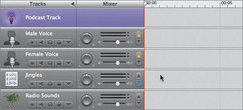 The podcast template includes a Podcast Track and four prebuilt audio tracks, including Male Voice, Female Voice, Jingles, and Radio Sounds. You can always add more tracks or delete unneeded tracks from the Timeline. Also, the ducking controls are on and have the voice tracks set as priority tracks; the Jingles and Radio Sounds tracks are set as backing tracks that will be ducked as needed to favor the voice tracks.