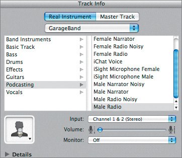 The Track Info pane appears for the selected track. Notice that the Podcasting instrument category has been selected, and Male Radio is the specific preset.