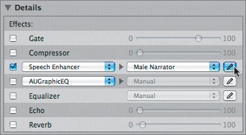 | | | 4. | To open the Speech Enhancer controls, click the Edit button (looks like a pencil) for the Male Narrator preset.