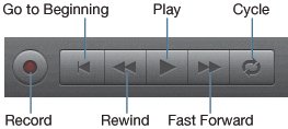 | There are several ways to play a project in the Timeline. In fact, many Garage-Band features can be accessed by menu, button, or keyboard shortcut. For example, to play a project you can click the Play button in the transport controls (the mouse method), or you can press the spacebar (the keyboard method). For this exercise, you'll start with the transport control buttons located at the bottom of the GarageBand window, below the Timeline.  | | 1. | In the transport controls, click the Go to Beginning button to move the playhead to the beginning of the song (if it is not already there).