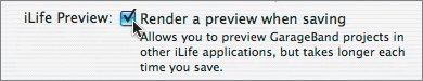 Note If you turn on this feature, an alert about saving with iLife preview will appear when you save other GarageBand projects until you turn it off again. When the feature is on, saving each project will take longer. You can always go back to Preferences and turn off iLife preview as needed. | 5. | Close the Preferences dialog.