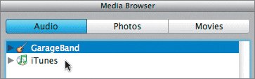 | | | 2. | Press Cmd-R to show the Media Browser. Click the Audio button to show the Audio pane within the browser.