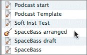 | That's it. The project has been saved with an iLife preview. Adding GarageBand Projects to the Media Browser Saving the project with iLife preview means that you can add it to your Garage-Band Timeline. First, you'll need to place it in the Audio pane of the Media Browser. By default, the Media Browser gives you access to your iTunes library in the Audio pane of the Media Browser. You can also add other folders containing audio files, including GarageBand projects. Let's reopen the Podcast start project and show the Media Browser. 1. | Choose File > Open Recent and choose the Podcast start project you were working on earlier in this lesson.