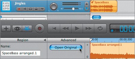 | You've successfully added a GarageBand project to the Timeline of another project. Of course, you might wonder what the big deal is about that. You can also export a finished mix of a song and just add the mixed audio file to a project the same way. Well, what if you change your mind? More importantly, what if your clients change their minds? It happensmore often than not, depending on the client. What if someone wants you to make changes to the song in the Timeline? Then what? If it is an audio file, you have to find the original project, or re-create it, then make the changes and export it again, then add the exported mix to the project. On the other hand, if you have a project in the Timeline, you simply open the project in the editor, click the Open Original song button, and voila! You're working on the original song again. Best of all, when you save the changes, the project automatically updates in the Timeline. It sounds more complicated than it is. Let's just try it. Editing a GarageBand Project Within Another Project To demonstrate editing a project within a project, you're going to open the SpaceBass project from the Podcast start project, change the panning on several tracks, then save it so it automatically updates in the Podcast start project. 1. | In the Timeline, select the SpaceBass project. Then press Cmd-E to open the editor.