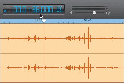 | 6. | Move the pointer over the waveform in the editor until the pointer changes to crosshairs. Click and drag the crosshair pointer from 01:38 to 01:40.