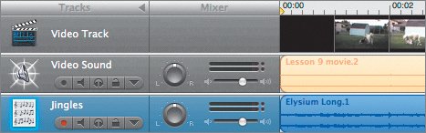 | Now that you've viewed the project and added markers, it's time to add some music. In the previous lessons, you've created and mixed music in the Timeline. For this exercise, you'll use some of the professional quality prere-corded music selections that come with GarageBand 3. Once the music is in place, you'll learn several techniques for adding sound effects to complete the project. Navigating Between Markers Before you add the music, let's take a minute to identify and navigate to the markers in the Timeline. Each marker appears as a yellow diamond in the Ruler. To quickly navigate from one marker to another, simply double-click the marker (yellow diamond) icon in the marker list. 1. | Press Cmd-I to close the Track Info pane.