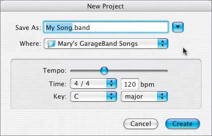 Note GarageBand 2 also includes a Major/Minor pop-up menu. You'll learn more about major and minor keys in Lesson 9. | 5. | Click Create in the lower-right corner of the New Project window to create your new project.