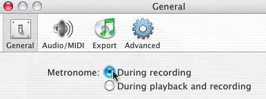 Note If you use only one drum loop for an entire song, no matter how good the loop is, eventually it becomes nothing more than a complex metronome. Try to mix it up and add some variety to your drum tracks to keep them from being so "loopy." | Changing the Metronome Preferences Earlier in this lesson you changed the metronome preferences for playback and recording. The metronome is very useful during recording, but it can be annoying during playback. You can turn it off anytime by pressing Ctrl-U, or you can change the preferences to play the metronome during recording only. 1. | Choose GarageBand > Preferences.