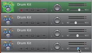 | 8. | Click-drag the Volume slider on the second Drum Kit track to a little bit below half on the Volume slider.