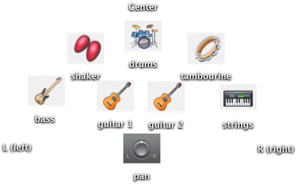 | Panning the Individual Tracks Now it's time to place the individual tracks in their proper position within the stereo field. There are many different styles for panning the tracks. The important thing is to spread the tracks out within the stereo field. Remember the panoramic photo of the Rocky Mountains? Imagine a beautiful panoramic picture with mountains spread from the left to right side of the frame, birds in the air, a stream in the foreground, a grove of trees on the right side, and a train cutting through the lower left of the frame. The photographer utilized the full stereo field when composing the picture. Now imagine the same photo taken from the top of a mountain looking directly at another mountain. All you see is a mountain peak in the middle of the frame and empty sky on either side. This photographer didn't utilize the full stereo field when composing the picture. Right now your song has all of the tracks panned to the center. To re-create that onstage in the real world, all of the musicians would have to line up one behind the other in the center of the stage, or on top of one another like a musical totem pole. That wouldn't look very natural, and it doesn't sound natural either. Your ears, trained or untrained, are accustomed to hearing where a sound is coming from, as well as hearing the sound itself. Let's use the pan controls to place the different musicians where they would be if they were performing this song onstage.  The illustration shows the relative position of the musicians performing Highway Bound onstage. The drums are in the middle of the stage (center pan position). The tambourine and shaker are performed by the backup singers on the left and right of the drums. The two guitars are next to each other, just to the left and right of center stage. The bass is on the left side of the stage, and the keyboard (which plays the strings) is on the right. To set the panning control for each instrument, simply adjust the Pan wheel so it is pointing in the direction of the instrument in the panoramic field of the stage. Let's start with the guitars. 1. | Locate the Acoustic Guitar 1 track.