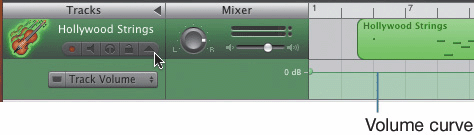 | So far, you have adjusted the different track volume and pan levels for each individual track using the controls in the Track Mixer. This method is great for setting one volume or pan level for an entire track. But what if you need the level to change during the song? This next series of exercises will show you how to change the volume and panning within a track by setting control points along the Volume or Pan curve. To make changes to a track's Volume or Pan curve, you first need to show the curve in the Timeline. Showing Volume Curves There are two ways to show the Volume curve for a track: Press A (for Audio) to show the Volume curve for the selected track. In the track header, click the triangle to the right of the Lock button. Our goal in the next two exercises is to show the Volume curve and then set control points on the Volume curve to fade the volume of the Hollywood Strings track up and down during the song. First, you need to show the Volume curve. 1. | Select the Hollywood Strings track.