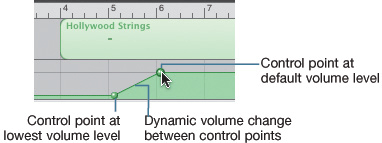 | Adding and Adjusting Control Points Now that you can see the Volume curve, you can make adjustments to it using control points. Control points set a fixed volume level on the Volume curve at a specific point along the Timeline. Changing the position of a control point allows you to bend the Volume curve, which raises or lowers the volume between the control points.  You need two control points to change the volume dynamically. The first control point is for the starting volume level. The second control point is for the new volume level. You can move a control point by click-dragging the point. You can add a new control point by clicking the Volume curve. Control points are often used to fade music in or fade music out. In a movie theater, the lights slowly fade down before the movie starts, then fade back up after the movie. With music, when you slowly fade the volume of a song up from silence or slowly fade the music down to silence, this is fading in or fading out the music. Let's add some control points to fade in the Hollywood Strings track. 1. | Locate the large green point on the far left of the Volume curve.