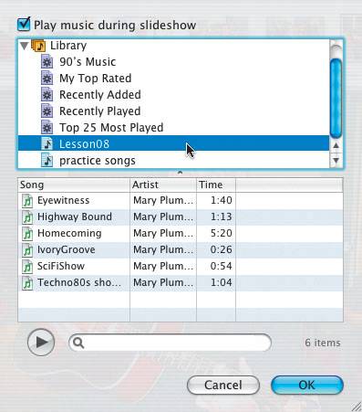 The Lesson08 playlist that you created from your GarageBand songs will now play in the background of the finished slideshow. If you prefer to play one song over and over during the slideshow, you can select a specific song from the playlist.