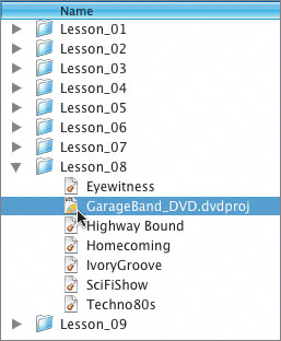 | More Info You can get more detailed information on the new features available in iMovie '05, including adding audio to your iMovie projects, in the iMovie Help menu and iMovie documentation that comes with the software. Using Your Playlist Songs in iDVD The seamless integration between all of the iLife applications includes iDVD, which has many new enhancements. The previous versions of iDVD were limited to 30 seconds of background music for your DVD menu, and only 3 minutes of music for a slideshow presentation. With iDVD '05, you can play 15 minutes of background music with your DVD menus and an entire playlist of songs for your slideshows. iDVD supports MP3 and AIFF audio files, just like iMovie does. To add a song or playlist to your DVD, you need to click the media panel in the Customize drawer, and then select your playlist or song. Let's walk through the process so you will be prepared to add music the next time you create a custom project in iDVD. Note Keep in mind that iDVD uses terms unique to iDVD. Throughout this exercise I will use the official iDVD terms. However, I will also explain what they are in case you are new to iDVD. 1. | Double-click the GarageBand_DVD project in the Lesson_08 folder on your computer to launch iDVD and open the GarageBand_DVD project.