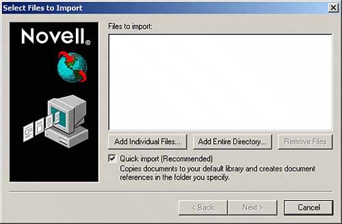 | Four methods exist for importing documents into a library: Quick Import, Custom Import, drag and drop, and the MAPI Send To feature. NOTE After a document is moved into a library, it can be accessed only through GroupWise or applications that integrate with GroupWise document management services. For example, if you create a document using Microsoft Word and save it in the library, you can still work on the document, but you must use the GroupWise document management dialog boxes to retrieve the document in Word. You can choose to copy documents into the library and maintain a copy outside the library, but you must then decide how both versions will be kept current. Using Quick Import Quick Import copies your documents into the default library with the default document property settings. (Document properties are explained under the section titled "Understanding Document Properties" later in this chapter.) Quick Import does not let you customize documents individually. Use a Quick Import when you need to place many files into the library all at once and you are not concerned about customizing the document properties for each document. Follow these steps to perform a Quick Import: 1. | Choose File, Import Documents. The dialog box shown in Figure 9.2 appears. Notice that the Quick Import option is selected by default.