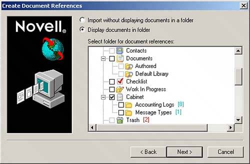 | 13. | If you chose to display the documents in a folder, click a check box in the Select Folder for Document References window to designate where the document references appear. Click Next. The Set Document Property Options dialog box appears, as shown in Figure 9.4.
