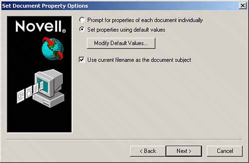 | 14. | Choose the Prompt for Properties of Each Document Individually option if you want to set different document properties for each document you chose in steps 4 and 5. (This step could be time consuming if you are importing many documents.) Alternatively, choose the Set Properties Using Default Values option to use the default properties for all documents.