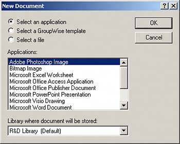 | 3. | If you want to use a specific application to create the document, select the application and click OK. If you want to base the document on a template, select the template and click OK. If, instead, you want to base the document on a file, select the file and click OK. The New Document dialog box appears, prompting you to enter a subject for the document.