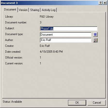 Library | The library that contains the document. | Document Number | A number assigned by GroupWise that is used by he document management service to identify the document. | Subject | A text field that enables you to assign a descriptive subject for the document, such as "1996 Annual Report." When you import documents, you have the option to make the filename and path the document subject. Otherwise, you can specify the subject as you create the document, or you can edit the subject in the properties screen. | Document Type | A classification for the document that is used to categorize and establish the usage of the document. For example, some common document types include Agenda, Contract, Memo, Minutes, Proposal, and Report. These classifications, or types, facilitate searches for specific documents. An important field in Document Type is the expiration setting. The expiration setting determines when a document expires and what should be done with the document when it expires. | Author | The author of the document. The author is not always the same as the creator. The author can be any GroupWise user. | Creator | The person who placed the document in the ibrary. | Date Created | The date and time the document was placed in the library. (If you imported the document from a file system, the date and time stamp on the file is not preserved in the document properties.) | Official Version | The version of the document that will be identified and viewed through searches. For example, if seven versions of the annual report were stored in the library, and version 6 was designated as the official version, it would be the version found in searches by GroupWise users who have View rights to the library. (Version 7 could be a draft in progress that is not yet ready for official release.) Any version of a document can be identified as the official version. If you do not specify an official version, the current version is the official version. Usually, the creator of the document designates the official version, but the right to set the official version can be granted to others. | Current Version | GroupWise document management services allow up to 100 versions of a document. The current version is the latest version of the document. | Description | A text field that enables you to describe the current version of the document. By default, the description for the first version of a document is "Original." | Status | The document status possibilities include "Available" (the document is available to be opened or checked out of the library), "In Use" (another user currently has the document opened or checked out), and "Checked-Out" (another user has checked out the document). | Sharing | This field shows the GroupWise users with whom you have shared the documents. You control the sharing properties for the documents you add to the library. By default, a document is not shared and cannot be accessed by other users. Sharing documents is discussed later in this chapter. (The rights you specify for shared documents apply to all versions of the document.) | Activity Log | The Activity Log property shows you a chrono-logical log of the actions that have been performed on the document, such as who created the document, who has opened the document, who has viewed the document, and who has edited the document |