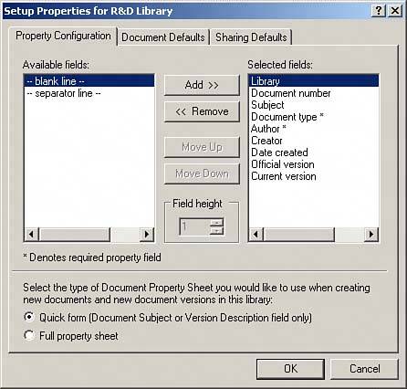 | 4. | On the Property Configuration tab, shown in Figure 9.10, select the document property fields that you want available for your documents by default.