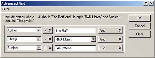 | 4. | Specify the Find criteria using the Advanced Find dialog box. Figure 9.11 shows how to find all entries where the author is Eric Raff, the library is the R&D Library, and the subject contains the word GroupWise.