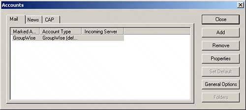 | After GroupWise is configured on your remote computer, a new icon labeled Accounts (Remote) is available in the Tools, Options menu. This icon is used to set default parameters for GroupWise Remote operations. When you double-click this icon, you see the Accounts dialog box, shown in Figure 10.9. (You can also access the accounts settings by choosing Accounts, Account Options.) Figure 10.9. Use the Accounts (Remote) options to establish GroupWise Remote parameters.  From the Accounts dialog box, you can select an account and click the Properties button to modify the connection properties for GroupWise Remote. You can also click General Options to force GroupWise to synchronize with the master mailbox on given intervals. TIP The Account options are also available from cache mode. The options vary when in this mode. The primary difference is that in remote mode you can be very granular with what you request to synchronize, whereas in cache mode, the GroupWise client will attempt to synchronize all item types. The important options you can configure in the properties screen are explained in Table 10.1. Table 10.1. GroupWise Remote Connection PropertiesPROPERTY | EXPLANATION |