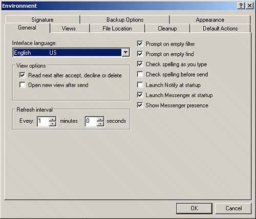| The Environment preferences group enables you to modify characteristics of the overall GroupWise program interface. When you double-click the Environment icon, you see a dialog box with seven (eight in remote and cache modes) tabs: General, Views, File Location, Cleanup, Default Actions, Signature, Backup Options (remote and cache modes only), and Appearance, as shown in Figure 11.2. Figure 11.2. Environment options pertain to the overall default settings for GroupWise.  NOTE In online mode, the Environment options tabs are all on the same row. Remote or cache mode places them on two different rows because of the extra Backup Options tab. General Under the General tab of the Environment options, you can set the following preferences: Interface Language This is the language you want to use in the client interface (menus, views, and so on). If the language you desire does not appear, contact your system administrator. Additional languages can be defined as the GroupWise client is installed. View Options These options enable you to read the next message after you accept, decline, or delete a message and to open a new, blank message after you send a message. Refresh Interval This option determines how often GroupWise checks for new messages. (The minimum is 1 minute [the default], and the maximum is 60 minutes and 59 seconds.) Prompt on Empty Filter This option causes a message to appear if a filter you created does not allow any messages to appear. Prompt on Empty Find This option causes a message to appear if a Find session doesn't generate any results. Check Spelling as You Type This new GroupWise 7 feature enables the GroupWise client to spell check as you type. Misspelled words are underlined in red. Right-clicking on a misspelled word provides a list of possible correct spellings to the word. Check Spelling Before Send This option checks the spelling of each message (subject line and message body) when the Send or Post button is selected. Launch Notify at Startup This option loads the Notify program, which will alert you to new messages and/or alarms set for appointments, when you start GroupWise. Launch Messenger at Startup This option loads the GroupWise Messenger program, which allows you to chat with other contacts. You will not see this option if the GroupWise Messenger is not installed on your computer. Check with your system administrator to see whether your organization uses the GroupWise Instant Messenger program. Show Messenger Presence This option shows the presence of other Messenger contacts in the Reply and Address Book interface. This makes it easy to see whether a co-worker is online from within the GroupWise client. You will not see this option if the GroupWise Messenger client is not installed. Check with your system administrator to see whether your organization uses the GroupWise Instant Messenger program. After you have set the General tab's options, you can select the Views tab's preferences. Views On the Views tab, shown in Figure 11.3, you can set the following preferences: Item Type Select the category (Mail, Phone, Reminder Note, Appointment, Task, and Calendar) and the message type (Group or Posted) for which you want to set the default. Views Choose from a list of available views for the selected item type. Set Default View Highlight the view you want as the default for the item type you specify. (When you choose File, New, this is the view that will appear for the message type you choose.) Default Compose View Here, you can set your default compose format as either HTML or Plain Text. HTML provides many more options for message formatting. You can also set the default font and font size for the Compose and Read views. Default Read View When reading messages, you can define whether the default view for the message is Plain Text or HTML. For plain text messages, you can also define the default font size and type to use when reading the message. For HTML messages, the sender defines the font type and format. Figure 11.3. The Views tab's options configure the default views for sending and receiving messages.