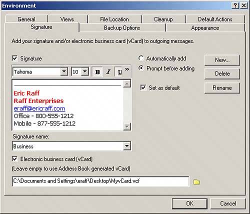 After you have set up the default actions, you can configure your signature. Signature You can enhance your GroupWise messages with Internet-style, custom signatures. Signatures are added to the end of any message you send. GroupWise 7 supports multiple signatures, allowing you to select the appropriate signature as you send a message. You can create signatures in HTML format, allowing you almost unlimited flexibility with your signatures. For example, you can create a business signature with your business contact information and company logo that you apply to business-related messages. You can also create other signatures that you could apply to personal, fun, or family-type messages. Because your signatures can be HTML based, you can add animated graphics, images, tables, bullets, font types, colors, and so on. GroupWise also enables you to send your own personal information (name, phone numbers, and so on) as it appears in the Address Book or from a user-defined file using the vCard format. This allows recipients of a message to simply double-click on your attached vCard file to import your contact information into their contact list no matter what mail system they may be running. NOTE The vCard format is a standard contact format that allows you to share your contact information with users in other mail systems. Contact your system administrator for information about creating your own custom vCard file. You also can specify additional signature information for each mail account (POP or IMAP) you are accessing with GroupWise. (This topic is covered in more detail in Chapter 8, "Advanced Features.") To configure signatures or vCard sending options, click the Signature tab in the Environment dialog box, as shown in Figure 11.7. Figure 11.7. The Signature tab allows you to configure signatures that can be applied to outgoing messages.