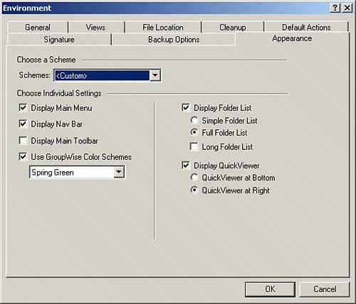 Following are the options available in the Signature tab: Signature When you select this check box, you can type a signature in the Signature box as you want it to appear at the end of your messages. Selecting this option also allows you to create multiple signatures; to do so, click the New button. HTML formatting options are available to enhance your signature. Signature Name This field defines what signature is being displayed. When you create multiple signatures, you can select each signature from this drop-down list. Electronic Business Card (vCard) This check box enables the sharing of your personal information in the vCard (VCF) format. vCard is a format for contact information that is recognized by many Internet-based and other types of email systems. Sending a message with a vCard adds a VCF file as an attachment. The recipient then opens the attachment and specifies which address book to add the contact into. For example, if you send a vCard attachment to a GroupWise recipient, the contact information is added to that person's personal address book or Frequent Contact list. If you want to use a custom vCard, enter the path to your custom vCard file. NOTE If you leave the path to the vCard file empty, the information that you send when you include a vCard signature (that is, attachment) is pulled from the GroupWise system address book, which the administrator enters and creates. Automatically Add This option automatically adds the default signature and/or vCard at the end of every message when you click Send. Prompt Before Adding This option, the default, asks whether you would like to add a signature and/or vCard information when you choose Send. Being prompted allows you to select an alternate signature from the default signature. Set as Default This option sets the currently displayed signature as the default signature. New This option allows you to create a new signature. New signatures require a name to uniquely identify them. Delete This option deletes the currently displayed signature. Rename This option allows you to rename the currently displayed signature. TIP You can copy text into the Clipboard from any application and place it in the Signature box. Any text you enter will be preceded by two hard returns. This is helpful to know whether you want your signature to appear with exactly one line between it and the last line of text in your message. In this case, don't end that last line with a hard return. Backup Options (Remote or Cache Mode Only) On the Backup Options tab, you can specify a directory in order to back up your remote or cache GroupWise mailbox to a file location. Click Backup Remote Mailbox, enter the directory path, make a selection in the Backup Remote Mailbox Every # Days option, and click OK. GroupWise backs up your remote mailbox to the location you specify. Remember, this option is available only in remote and cache modes. If you need to access this backup to restore mail, you can simply choose File, Open Backup, and you will see items that are located in the backup but not located in your remote or cache mailbox. This makes finding and restoring items very simple because you will see only the items in the backup location that may be missing from your main remote or cache mailbox. Appearance The Appearance option allows you to define the basic appearance of the GroupWise 7 client. Refer to Chapter 1, "Introduction to GroupWise 7," for a detailed description of what each appearance element represents. Figure 11.8 shows the available appearance options. Figure 11.8. The appearance options allow you to customize the look and feel of the GroupWise client.