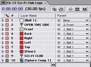 | To simplify animating the steel box and its text label, you'll animate a Null Object layer instead and parent the other layers to it. You can think of a Null Object layer as basically an invisible solid; when it serves as a parent to other layers, the other layers imitate its every move. As a result, your box will fly in from space, and the side labeled OPEN THIS SIDE will slide open to reveal the spinning globe: 1. | Choose Layer > New > Null Object.