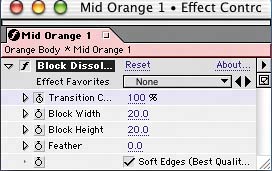 | The Transition effects in After Effects are generally used between scenes or to get an object on or off the screen. In this case, you'll use the Block Dissolve Transition effect to bring in an object: 1. | Go to time 0;15, and apply Effect > Transition > Block Dissolve to the Mid Orange solid layer.