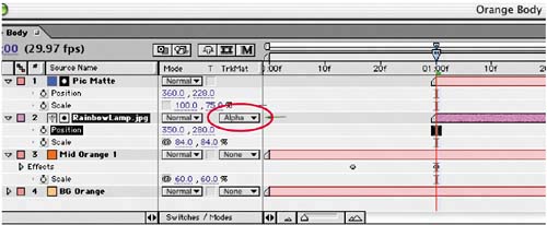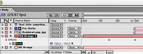 | 8. | Add RainbowLamp.jpg to the Orange Body Timeline at time 1;00, and drag it under the Pic Matte layer.