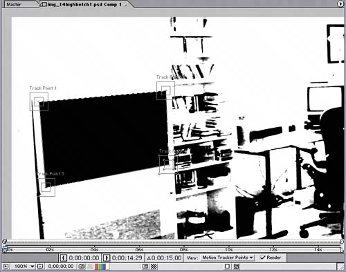Positioning one of the Track Points The Track Points in position to start tracking the TV screen's motion  | Tracking the still's motion Now that you've set up the perspective corner pin Track Points on each corner of the TV screen, you can begin tracking the motion of the still image. Follow these steps: 1. | Go to time 6;15 in the Img_14bigSketch1 Comp 1 layer window, and click the Set Out Point button at the bottom of the Layer window. Clicking this button specifies where you want the motion tracker to stop tracking in time. The image stops moving at that point, so you don't need track the motion beyond that point in time.